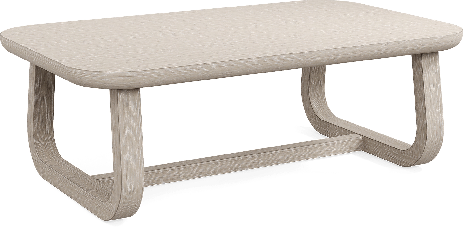 Gather 'round in light and lively style with the inspired Drew & Jonathan Canyon cocktail table. Contemporary flair and oak veneers in a light gray wash give this piece a look that's equal parts unique and familiar. The rectangular top and trestle-like base showcases unique curves and bent shapes that evoke unmistakable midcentury character.