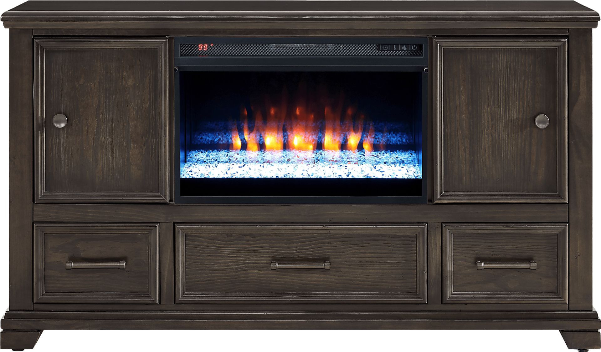 like the warm glow of a sunbeam on a crisp fall day, the Canyon River console creates a playful haven where light dances across each luxurious surface. This contemporary accent is crafted with pine veneers in an indulgent java finish. Two cabinets provide wire management and ample space for entertainment devices or decorative accents, while three drawers below feature bronzed metal bar pull hardware, echoing the knobs of each cabinet. This piece comes with an electric "crystal" fireplace that features ambient lighting with four color changing options across a gorgeous display of LED lights. A convenient remote controls glow levels and includes a built-in timer and adjustable thermostat.