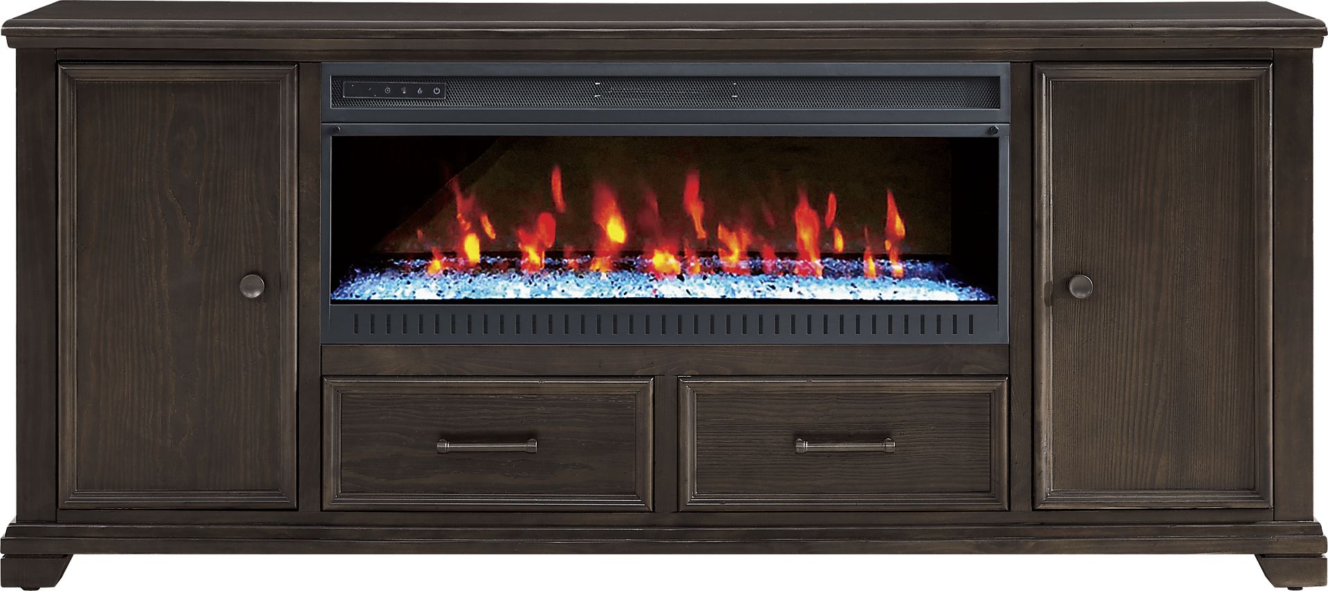 like the warm glow of a sunbeam on a crisp fall day, the Canyon River console creates a playful haven where light dances across each luxurious surface. This contemporary accent is crafted with pine veneers in an indulgent java finish. Two cabinets provide wire management and ample space for entertainment devices or decorative accents. Two drawers below feature bronzed metal bar pull hardware, echoing the knobs on each cabinet. This piece comes with an electric "crystal" fireplace that features ambient lighting with four color changing options across a gorgeous display of LED lights. A convenient remote controls glow levels and includes a built-in timer and adjustable thermostat.