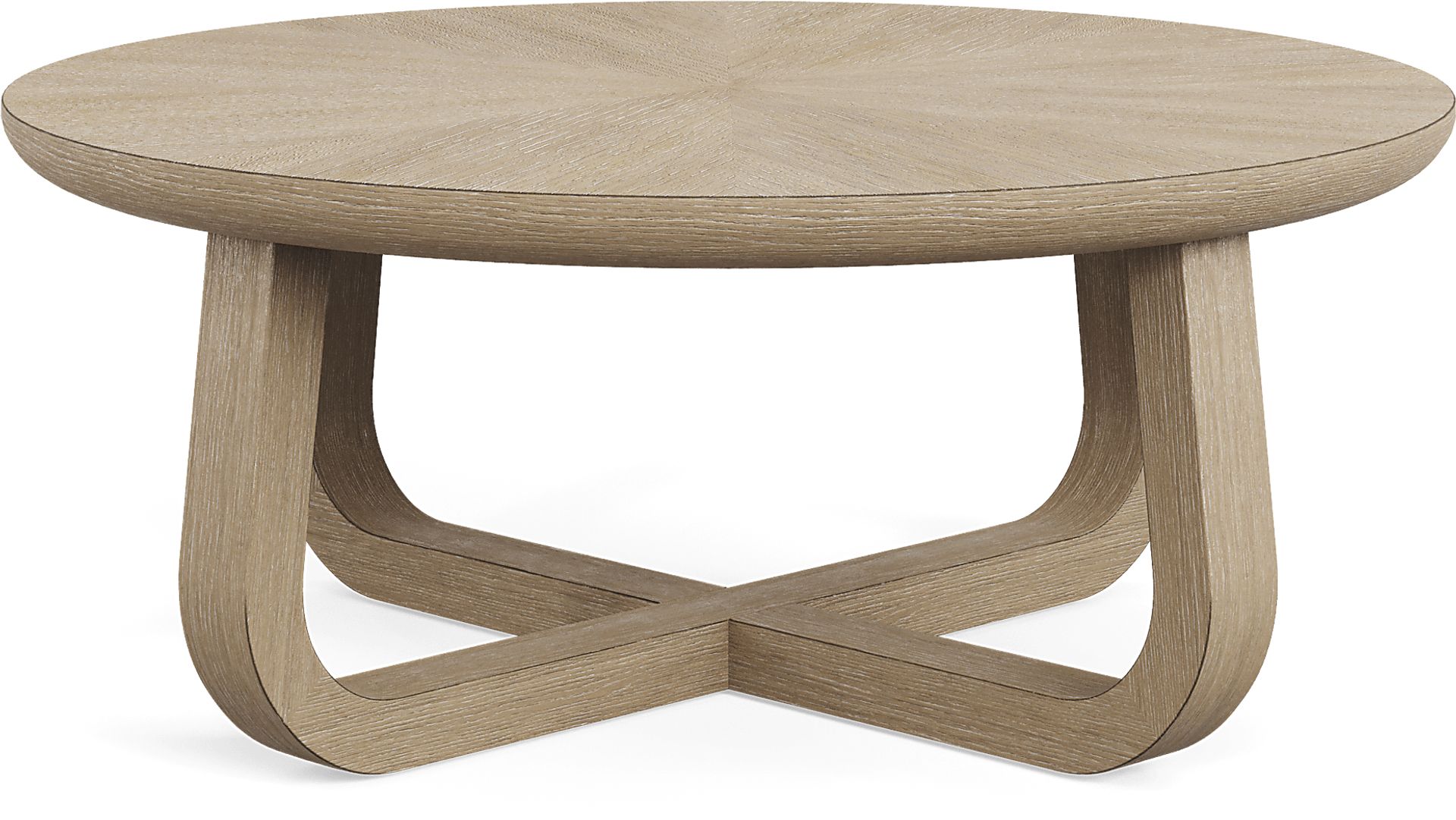 Gather 'round in light and lively style with the inspired Drew & Jonathan Canyon cocktail table. Contemporary flair and a sandstone colored wash give this piece a look that's equal parts unique and familiar. The crossed base creates space for storage as well as an interesting stirrup design, and the natural material and bent shapes evoke unmistakable midcentury character. Oak veneers make this piece easy to care for and enjoy for years to come.