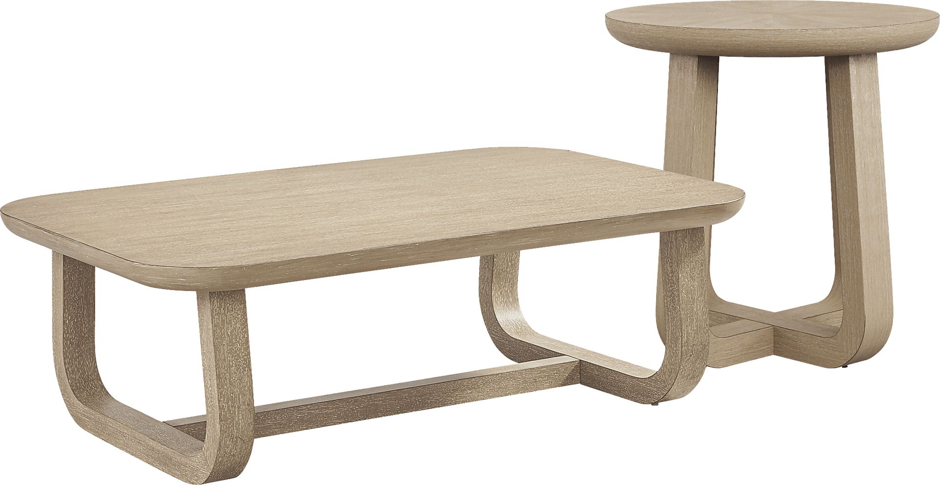 Gather 'round in light and lively style with the inspired Drew & Jonathan Canyon table collection. Contemporary flair and oak veneers in a sandstone-colored wash give this rectangular cocktail table and matching round end table a look that's equal parts unique and familiar. The crossed bases create space for storage as well as an interesting stirrup design, and the natural materials and bent shapes evoke unmistakable midcentury character.