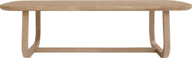 Subtle art deco flair infused with warm, family-friendly appeal is the hallmark of the captivating curves and lines of the Drew & Jonathan Canyon dining table. This piece exudes contemporary charm with quarter-cut oak veneers in a sand colored finish shaped into organic stirrup-style bends. An open double-pedestal design showcases the table's interconnected base, and the handsome curved edge on the tabletop invites comfortable, casual enjoyment.