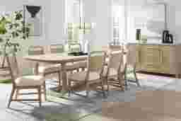 Subtle art deco flair infused with warm, family-friendly appeal is the hallmark of the captivating curves and lines of the Drew & Jonathan Canyon dining room. This set exudes contemporary charm with quarter-cut oak veneers in a sand colored finish shaped into organic stirrup-style bends. An open double-pedestal design showcases the table's interconnected base, and the handsome curved edge on the tabletop invites comfortable, casual enjoyment. Four wood-back side chairs mirror the distinctive style with angled, tapered legs and seats upholstered in white fabric.