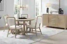 Subtle art deco flair infused with warm, family-friendly appeal is the hallmark of the captivating curves and lines of the Drew & Jonathan Canyon dining room. This set exudes contemporary charm with quarter-cut oak veneers in a sand colored finish shaped into organic stirrup-style bends. An open pedestal design showcases the table's interconnected base, and the handsome curved edge on the tabletop invites comfortable, casual enjoyment. Four side chairs mirror the distinctive style with angled, tapered legs complemented by curved backs and seats upholstered in white fabric.