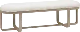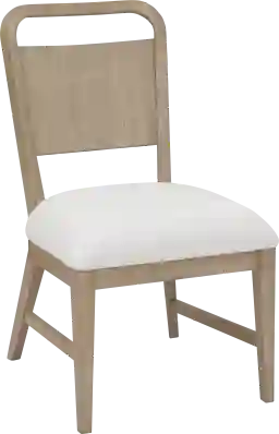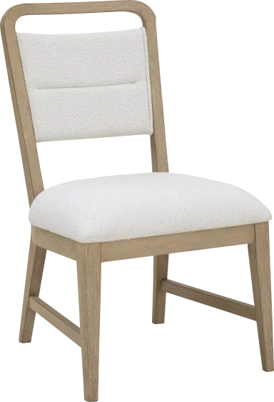 Subtle art deco flair infused with warm, family-friendly appeal is the hallmark of the captivating curves and lines of the Drew & Jonathan Canyon dining room. This set exudes contemporary charm with quarter-cut oak veneers in a sand colored finish shaped into organic stirrup-style bends. An open double-pedestal design showcases the table's interconnected base, and the handsome curved edge on the tabletop invites comfortable, casual enjoyment. Four wood-back side chairs mirror the distinctive style with angled, tapered legs and seats upholstered in white fabric. A matching bench with soft upholstery completes the look.