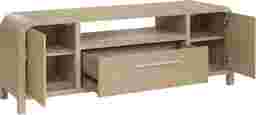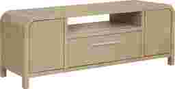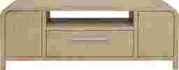 Subtle art deco flair infused with warm, family-friendly appeal gives the Drew & Jonathan Canyon console its signature sophistication. Constructed with oak veneers in a light gray finish, this contemporary piece features a rounded frame and silver metal pulls, providing a soft holistic look. Cabinets on either end hide shelves and storage, while a central drawer offers even more space for media, electronics and living room essentials. A pass-through cubby on top is designed with wire management in mind, perfect for game consoles, video players and streaming devices.