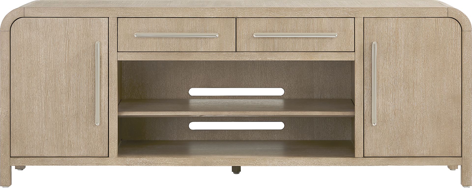 Subtle art deco flair infused with warm, family-friendly appeal gives the Drew & Jonathan Canyon console its signature sophistication. Constructed with oak veneers in a sandstone finish, this contemporary piece features a rounded frame and silver metal pulls, providing a soft holistic look. Cabinets on either end hide shelves and storage, while two top drawers offer even more space for media, electronics and living room essentials. Two open shelves are designed with wire management holes, creating a clean, clutter-free set up for game consoles, video players and streaming devices.