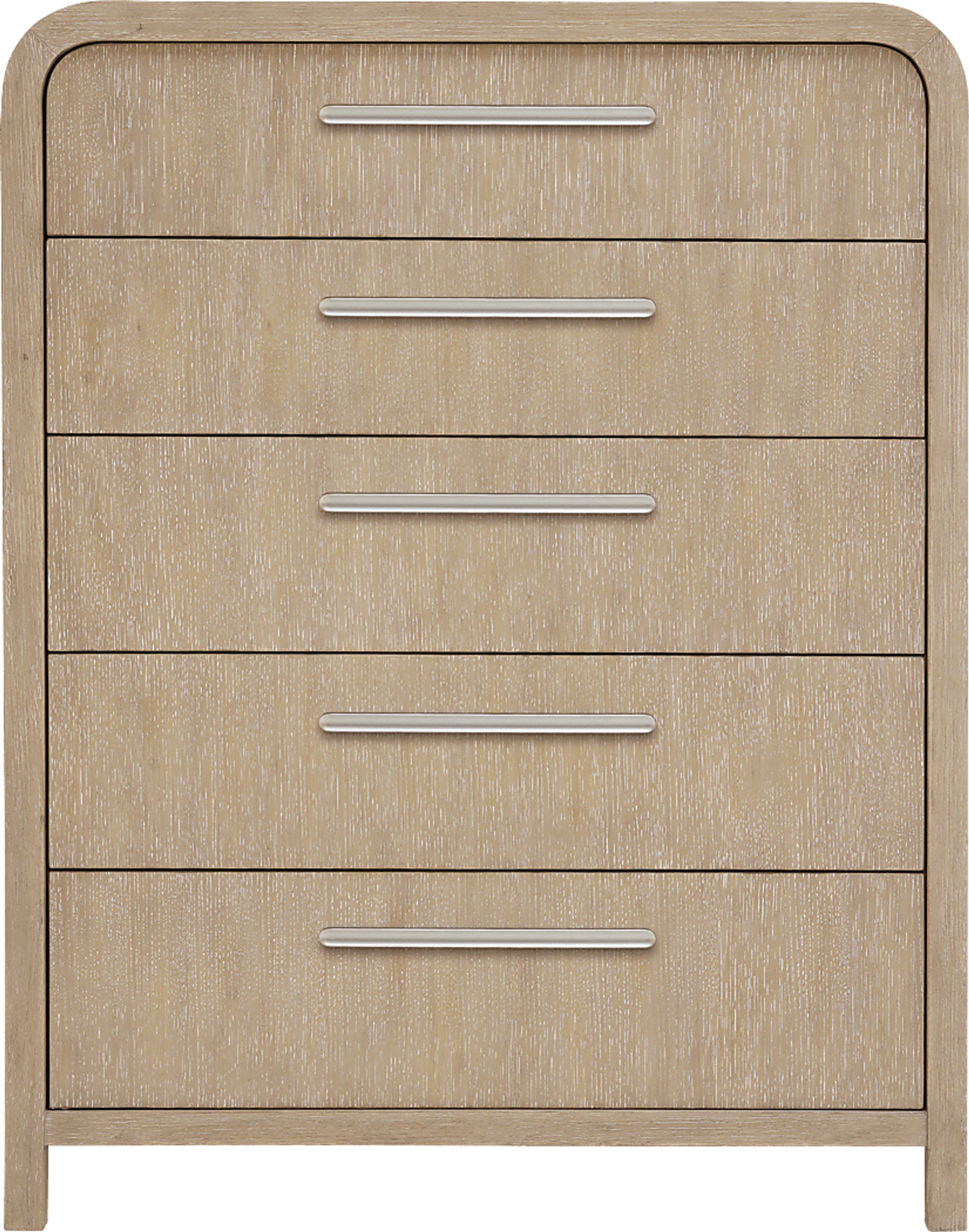 Exuding a calm and meditative ambiance, the Drew & Jonathan Canyon chest's natural elements and curved design presents a warm sophistication for your personal retreat. Constructed with oak veneers, this contemporary piece features a rounded frame with silver metal pulls, providing a soft holistic look. French dovetail construction in the front and English dovetail in the back with full extension ball-bearing glides secure the support and longevity of all five drawers.