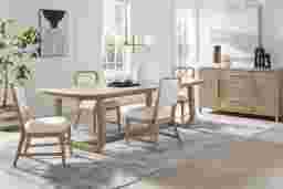 Subtle art deco flair infused with warm, family-friendly appeal is the hallmark of the captivating curves and lines of the Drew & Jonathan Canyon dining table. This piece exudes contemporary charm with quarter-cut oak veneers in a sand colored finish shaped into organic stirrup-style bends. An open double-pedestal design showcases the table's interconnected base, and the handsome curved edge on the tabletop invites comfortable, casual enjoyment.