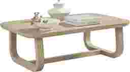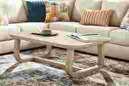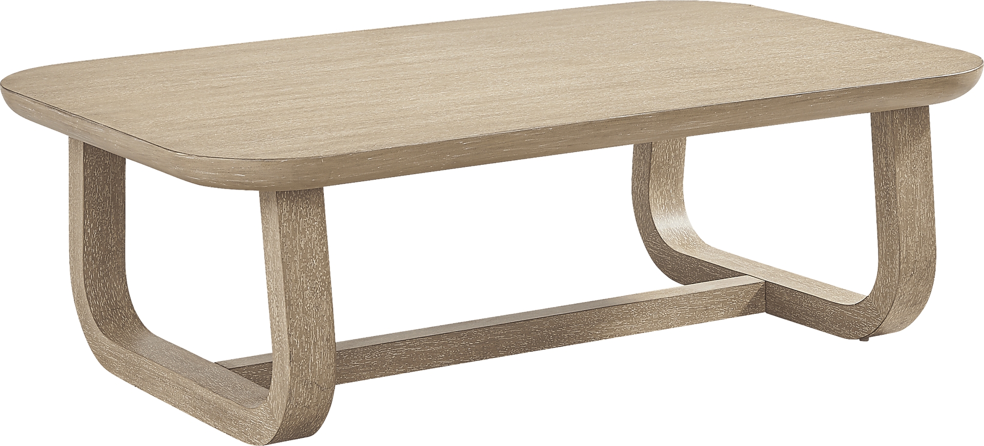 Gather 'round in light and lively style with the inspired Drew & Jonathan Canyon cocktail table. Contemporary flair and oak veneers in a sandstone-colored wash give this piece a look that's equal parts unique and familiar. The rectangular top and trestle-like base showcases unique curves and bent shapes that evoke unmistakable midcentury character.