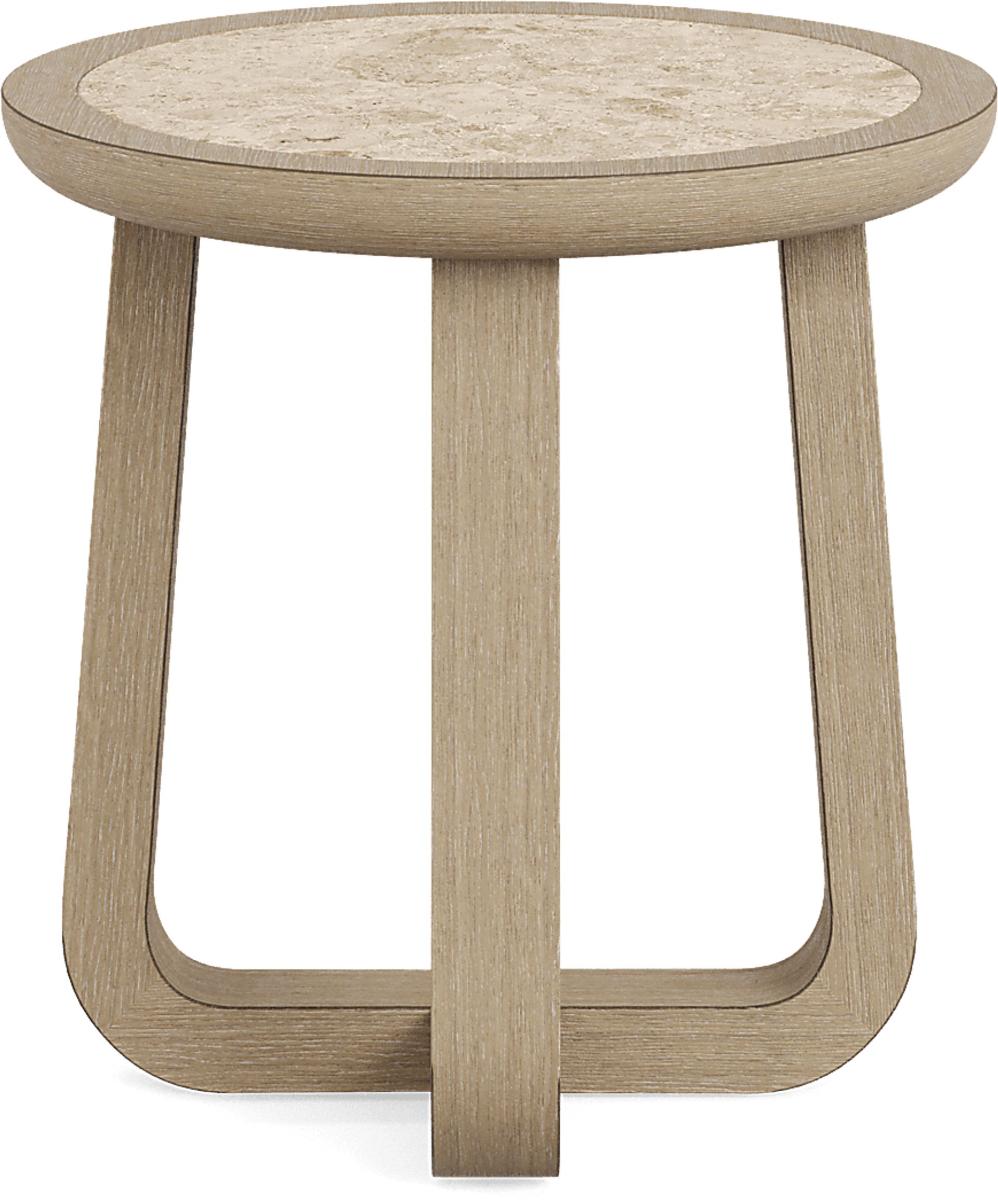Gather 'round in light and lively style with the inspired Drew & Jonathan Canyon end table. Contemporary flair, a round stone top and oak veneers in a sandstone-colored wash gives this piece a look that's equal parts unique and familiar. The crossed base creates space for storage as well as an interesting stirrup design, and the natural material and bent shapes evoke unmistakable midcentury character.