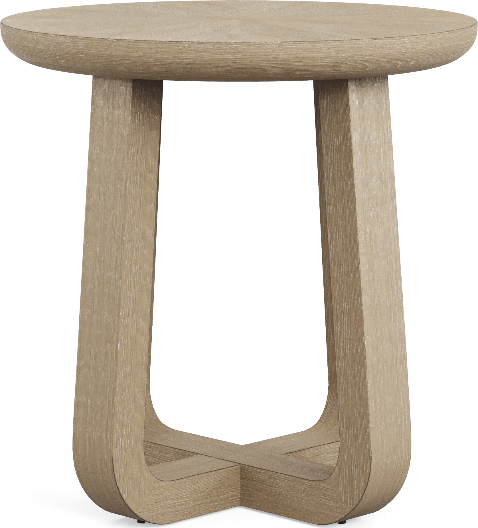 Gather 'round in light and lively style with the inspired Drew & Jonathan Canyon end table. Contemporary flair, a round top and oak veneers in a sandstone-colored wash gives this piece a look that's equal parts unique and familiar. The crossed base creates space for storage as well as an interesting stirrup design, and the natural material and bent shapes evoke unmistakable midcentury character.