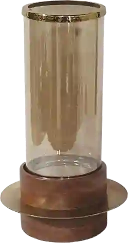 Style the Capania I gold candle holder in any transitional inspired den or study. Showcasing a gold toned metal sliced between an acacia wood pillar base. Gold trim finished off the look of the glass candle holder and offers a soft glow when styled with a lit candle.