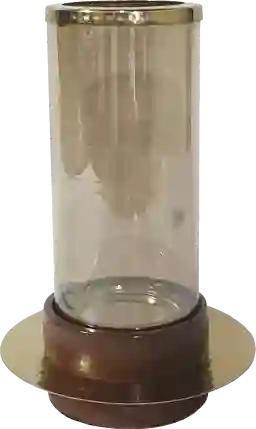 Style the Capania II gold candle holder in any transitional inspired den or study. Showcasing a gold toned metal sliced between an acacia wood pillar base. Gold trim finished off the look of the glass candle holder and offers a soft glow when styled with a lit candle.