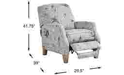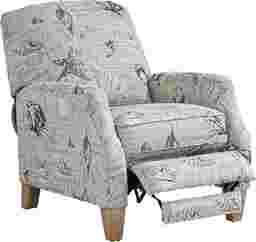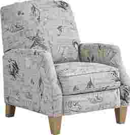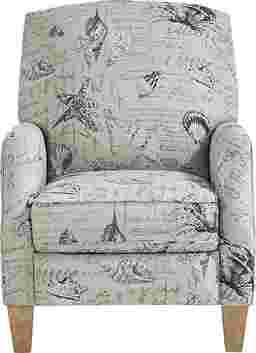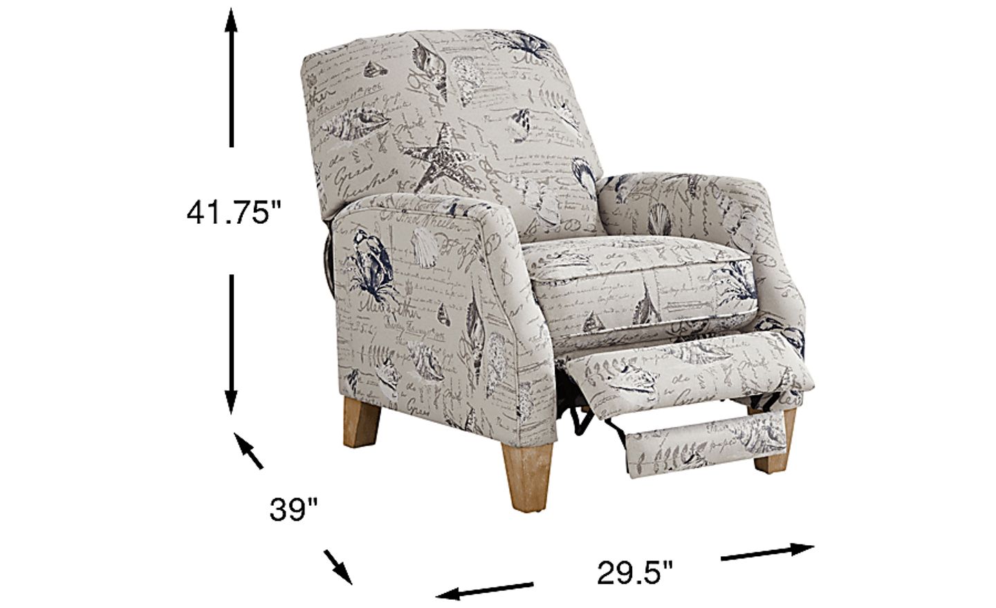 Named after a seaside paradise with beach access at the end of every block, the Cape Charles recliner offers irresistible relaxation and peace of mind. Upholstered with fabric that features the likes of sea stars and shells offset against a neutral beige color, you'll treasure the chic coastal flair of this piece. The silhouette is neatly fashioned with rolled arms for an extra hint of elegance. As for reclining, simply shift your weight backwards into the plush padded cushions while seated and enjoy the comfort supplied by the hidden footrest as you effortlessly lean back. The spectacular look wouldn't be complete without the addition of tall, tapered legs crafted in light brown finish. 100% Polyester.