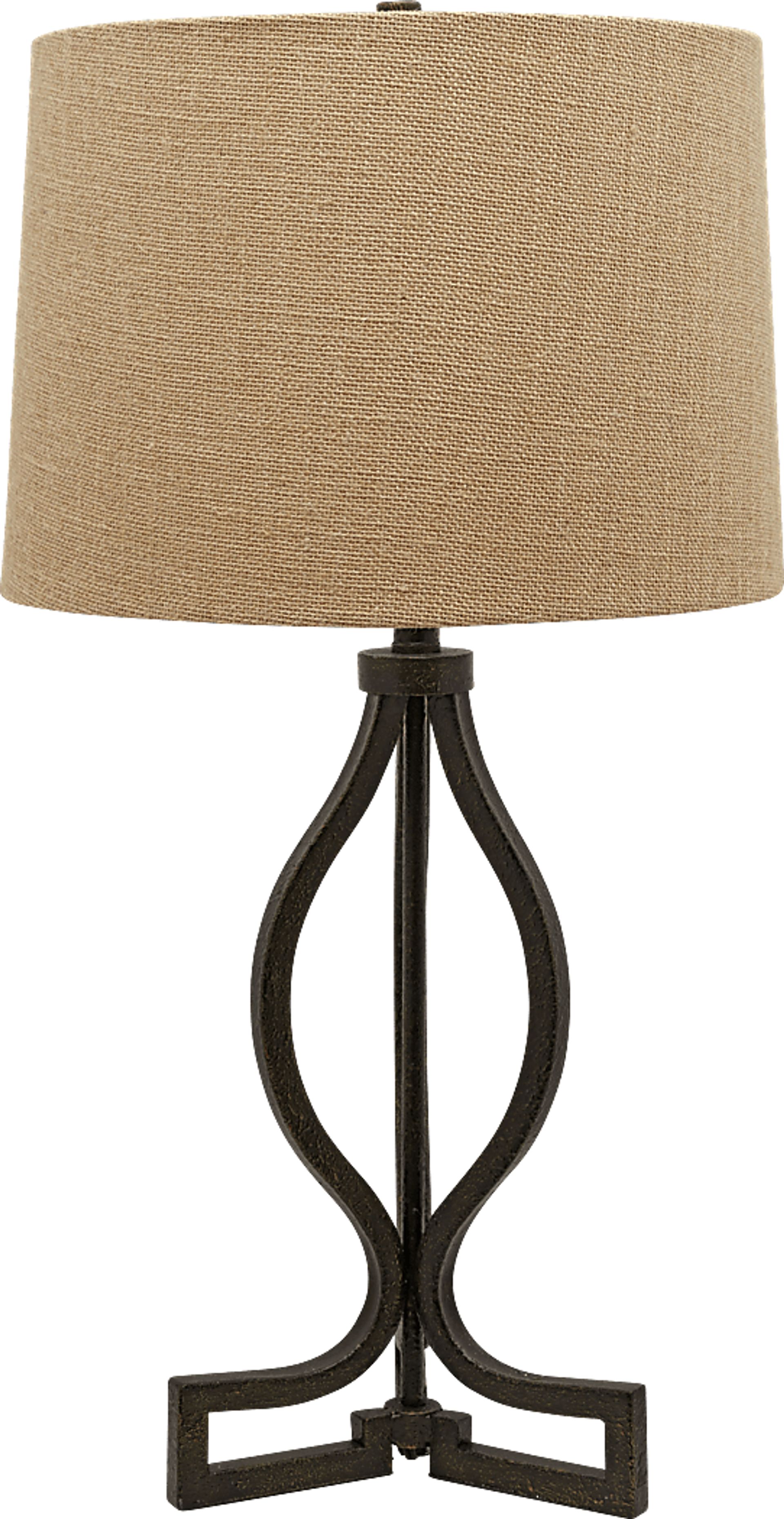 Casting a romantic glow, the Capulet lamp creates an inviting atmosphere in any living space. Featuring an elegant black finished wrought iron base, this lamp is topped with a tan burlap shade and takes one 150 Watt maximum bulb.
