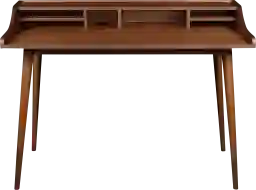 The Caputa brown desk features an American walnut veneer top with solid wood legs. The top contains six open shelves of varying sizes to store all your small office supplies in one easy-to-reach location. Customer assembly is required.