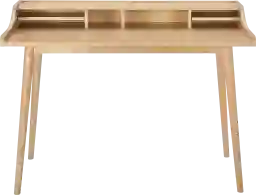 The Caputa light brown desk features an American natural white oak veneer top with solid wood legs. The top contains six open shelves of varying sizes to store all your small office supplies in one easy-to-reach location. Customer assembly is required.