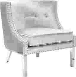 Bring a beautiful touch of contemporary charm to your home courtesy of this Carbery accent chair. The unique velvet high-style design with chic short, sturdy, polished steel legs creates an atmosphere in your home. The chair features integrated curved back and armrests and a row of buttons on the back and trimmed with nail heads, give both support and comfort. Update your style and enjoy it in any room you place it in. Customer assembly is required.