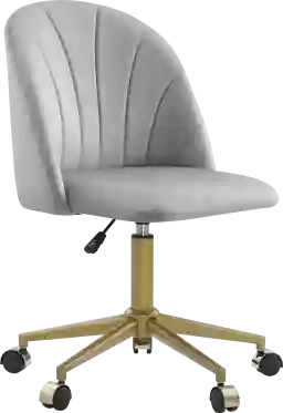 Shake things up in your home workspace with the chic Cardlow gray desk chair. Wrapped in soft velvet upholstery, this piece is as comfortable as it is eye-catching and easy to maintain. Its barrel-shaped back offers ergonomic support and features elegant channel stitching that adds depth and a subtle sophistication. Equipped with adjustable height settings and easy-rolling casters, this chair offers seamless mobility, while the sturdy steel base delivers lasting stability. Customer assembly is required.