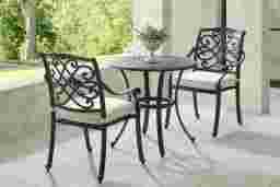 Cut loose, relax and revel with the whole crew in French Quarter style with the classic outdoor design of the Carina dining set from Cindy Crawford Home. Solid cast aluminum in a weather-resistant, hand-brushed bronze finish displays gorgeous patterns throughout the 30" round tabletop. Each seat back features intertwined scroll details that elevate the look even further. Durable and fade-resistant cushions in a desert beige outdoor fabric offer comfort and lasting color.