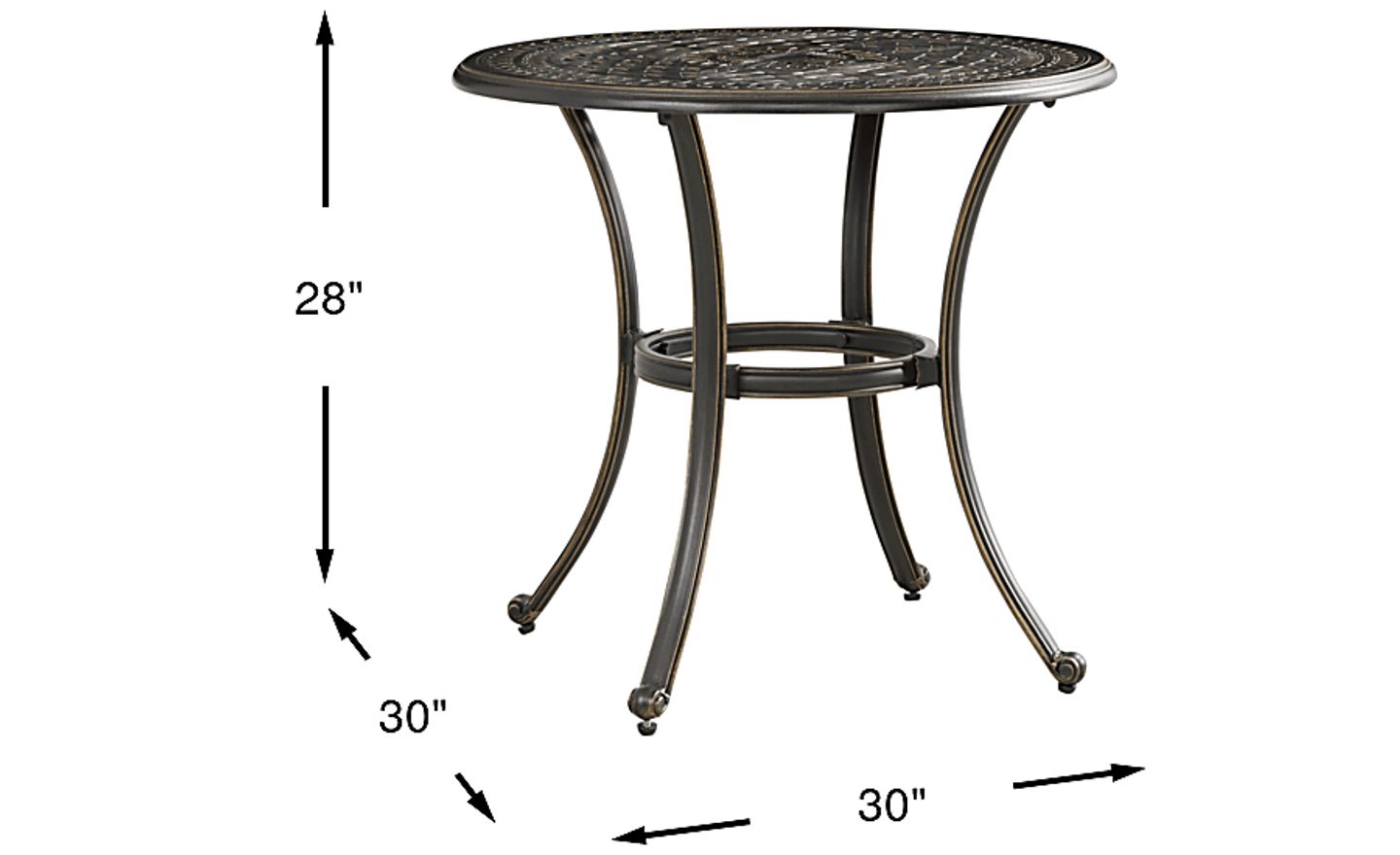Cut loose, relax and revel with the whole crew in French Quarter style with the classic outdoor design of the Carina dining table from Cindy Crawford Home. Solid cast aluminum in a weather-resistant, hand-brushed bronze finish displays gorgeous patterns throughout the 30" round tabletop.