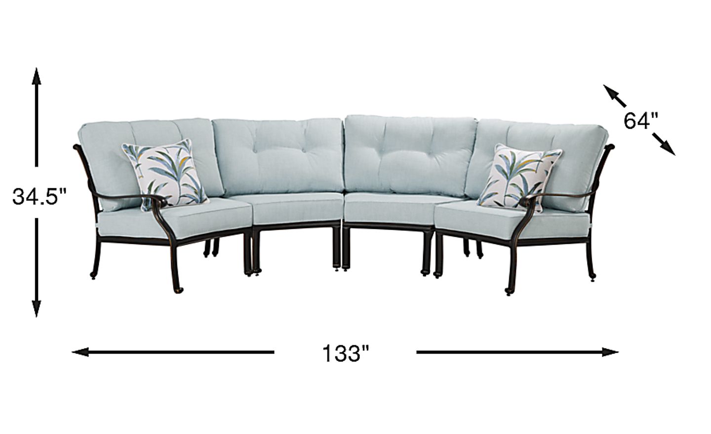 This is a large-scale seating solution with total dimensions of 133"W x 64"D x 34.50"H. For the most comfortable layout, we recommend placing it on a spacious patio or deck where you can maintain at least 18 to 24 inches of clearance around the perimeter for easy foot traffic. Because it is a 4-piece configuration, it provides generous seating for larger families or those who frequently host outdoor gatherings.