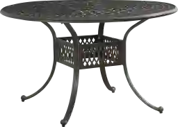 Cut loose, relax and revel with the whole crew in French Quarter style with the classic outdoor design of the Carina dining table from Cindy Crawford Home. Solid cast aluminum in a weather-resistant, hand-brushed bronze finish displays gorgeous patterns throughout the 48" round tabletop. The umbrella hole with cap offers an option for enjoyment rain or shine.