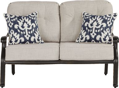 Cut loose, relax and revel with the whole crew in French Quarter style with the classic outdoor design of the Carina chat set from Cindy Crawford Home. Solid cast aluminum in a weather-resistant, hand-brushed bronze finish displays gorgeous intertwining patterns across each scrolled arm and intricate seat back. Seats with soothing swivel motion make for an even more relaxing experience. Durable and fade-resistant cushions in a desert beige outdoor fabric complete the look with comfort and lasting color.