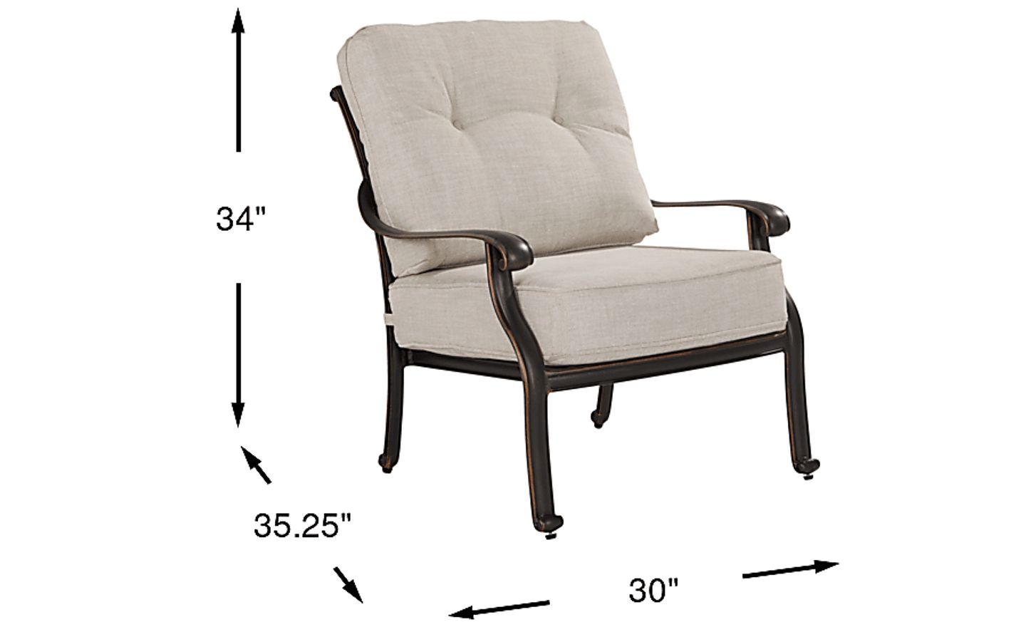 Cut loose, relax and revel with the whole crew in French Quarter style with the classic outdoor design of the Carina club chair from Cindy Crawford Home. Solid cast aluminum in a weather-resistant, hand-brushed bronze finish displays gorgeous intertwining patterns across each scrolled arm and intricate seat back. Durable and fade-resistant cushions in a desert beige outdoor fabric complete the look with comfort and lasting color.