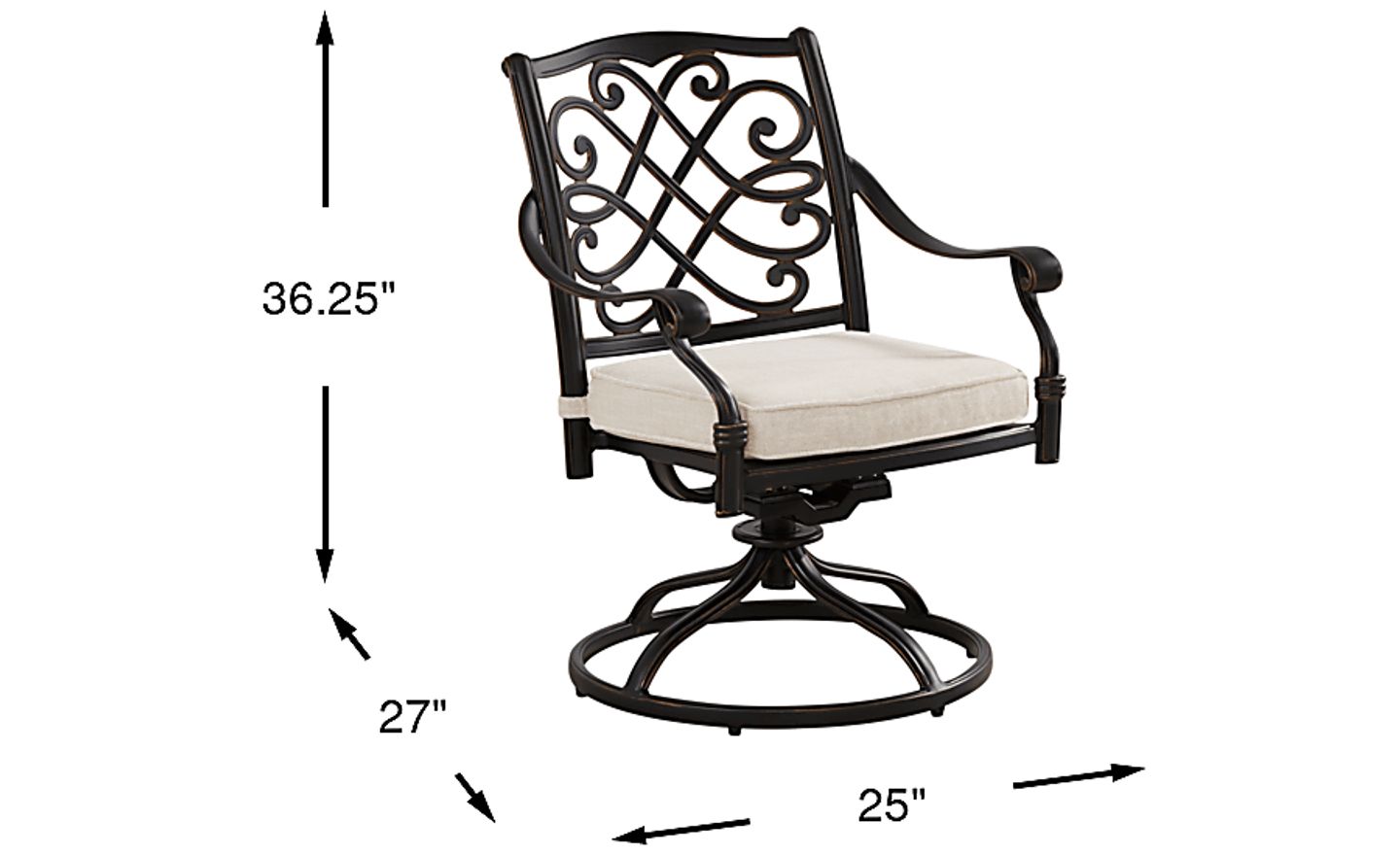 Cut loose, relax and revel with the whole crew in French Quarter style with the classic outdoor design of the Carina swivel rocker chair from Cindy Crawford Home. Solid cast aluminum in a weather-resistant, hand-brushed bronze finish displays gorgeous patterns from the elegantly curved legs to the comfortable seat. The back features intertwined scroll details that elevate the look even further. A durable and fade-resistant cushion in a desert beige outdoor fabric offers comfort and lasting color.
