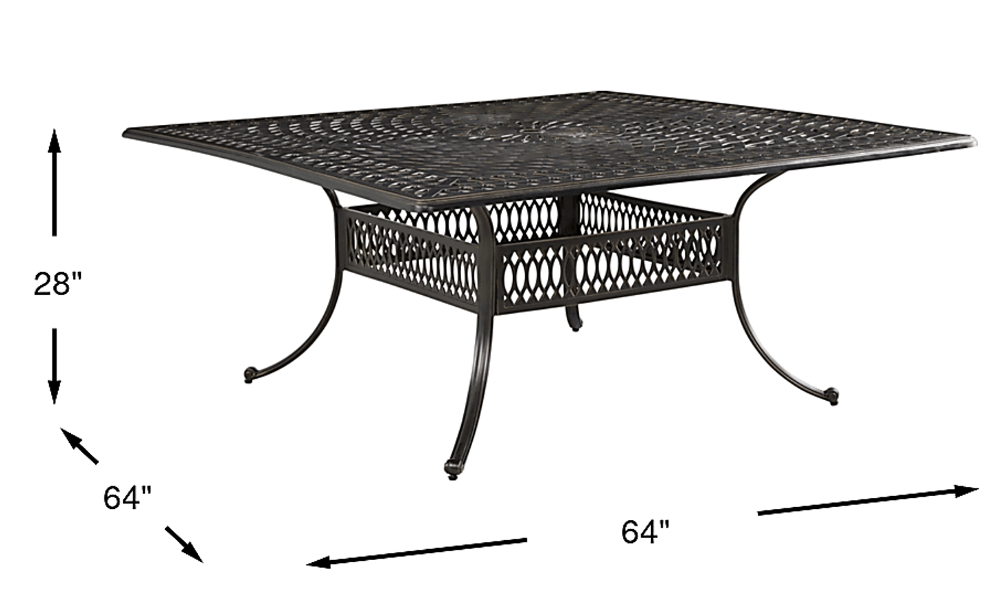 Cut loose, relax and revel with the whole crew in French Quarter style with the classic outdoor design of the Carina dining table from Cindy Crawford Home. Solid cast aluminum in a weather-resistant, hand-brushed bronze finish displays gorgeous patterns throughout the 64" square tabletop. The umbrella hole with cap offers an option for enjoyment rain or shine.