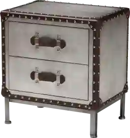 Embellish your interior with the poise of industrial vigor through the stunning Carlyley silver end table. This vintage inspired piece consists of a sturdy wood frame ornamented with a sleek metal casing. Two drawers offer convenient storage for household essentials, while reserving the tabletop as a chic display area. The Carlyley is adorned with faux leather handles as well as nail head studded bands for an added touch of robust timelessness. Straight legs with rounded feet complete the look, making the Carlyley an enchanting fixture of any layout.
