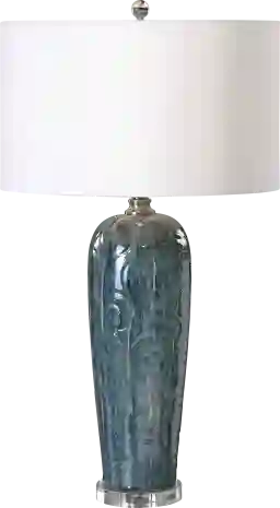The Carmean lamp combines high quality materials to create a unique, artistic inspired lamp that will add a pop of color to your space. Heather blue ceramic featuring subtle decorative embossing with silver ivory highlights and rust undertones accented with brushed nickel details and a crystal foot. The round hardback drum shade is a white linen fabric. Partial assembly may be required.