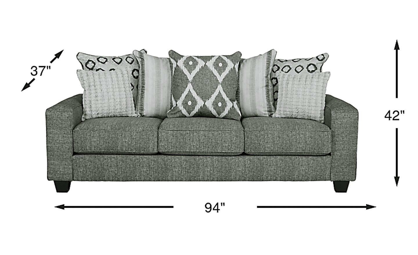 Offering stylish seating, the Carole Court sofa combines comfort and contemporary design. Upholstered in velvety smooth gray woven fabric, this tailored silhouette featuring welted reversible seat cushions and track arms offers a sleek aesthetic. A mix of patterned and solid pillows in coordinating shades of gray and white add a unique dimensional look. 100% Polyester