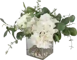 The Carolus is an airy mix as if freshly cut from the garden, featuring cream hydrangeas, roses, eucalyptus placed into a glass vase with faux water. Customer assembly is required.