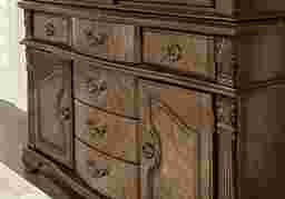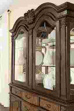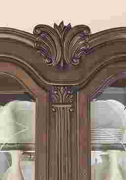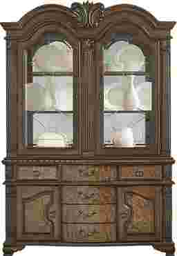 The Carpathian china cabinet is a wonderful piece, providing a decorative storage option as well as an attractive display area. Made of wood solids with a rich cherry finish, with burl veneer accents, the hutch features etched glass doors, mirrored interior and subtle lighting. The lower unit has felt-lined top drawers and ample storage. Intricate carving and traditional styling have old-world appeal.