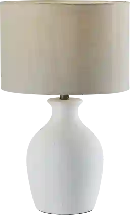 Drawing on farmhouse and contemporary stylings, the Carranza Farm lamp brings softened warmth to living rooms, bedrooms, and offices. The white jug-shaped ceramic base features thick texturing and is perfectly offset by a light brown fabric drum shade. When the 100W bulb is lit, it highlights the texturing of the fabric shade for a soft, warm look. Partial assembly may be required.