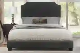 Darker upholstery, like this dark gray finish, is highly practical for busy households as it is more forgiving with minor marks or oils than lighter beige or white fabrics. This makes it an ideal choice for primary bedrooms or guest rooms that see frequent use, providing a high-end look that is easier to maintain over the long term.