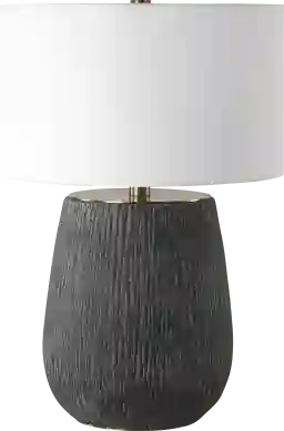 The Carten Post Black Lamp features a concrete base with deep organic texturing finished in an aged black with light gray antiquing, accented with brass plated details. The round hardback drum shade is a casual white linen fabric. Partial assembly may be required.