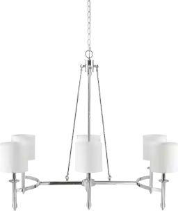 This fixture is designed to provide ambient lighting, creating a warm and inviting atmosphere throughout the room. It features six white cylindrical fabric shades that effectively diffuse light, reducing harsh glare and ensuring a soft, even glow that is ideal for both formal dining and casual living areas.