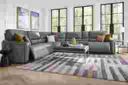 With its bold presence extending an invitation to all-enveloping luxury, the Cascade Way sectional by Shaquille O'Neal Home is a certified-VIP experience that makes unrivaled flair your home court advantage. Upholstered in exceptionally soft top grain leather where the body touches in blue, the extra-wide seats offer elbow room galore for big families and all your friends. A unique wraparound detail adds modern flair to the curved track arms. Each seat features chic top-stitched seams and plush attached back cushions at an ideal angle for relaxation. Dual power reclining seats include adjustable headrests and footrests, as well as hidden controls for a uniformly tailored look. The console includes USB-A and USB-C charging, hidden storage and hidden cupholders for a final touch of total convenience. Includes dual power reclining LAF seat, console, armless dual power recliner, wedge seat, armless seat and dual power reclining RAF seat. Upholstery: Top grain leather where the body touches and polyurethane fabric sides and backs. Leather is a durable, low maintenance product, however, general regular maintenance is necessary. To keep your leather clean, vacuum it regularly, removing any dust, and clean it with water and a mild non-detergent soap.