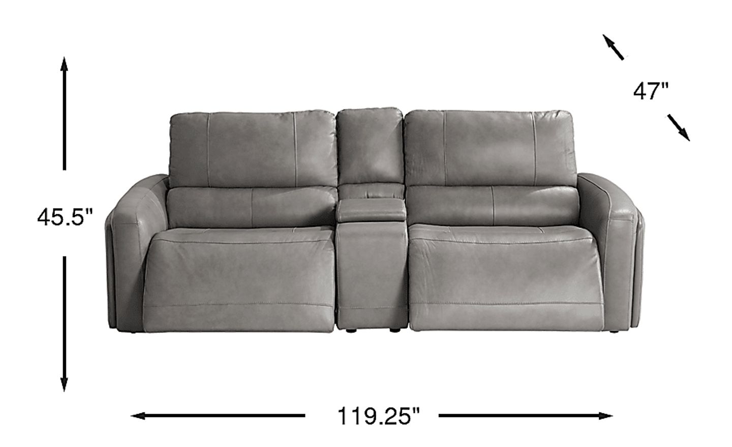 Like the magic of sitting courtside for the very first time, the Cascade Way sofa by Shaquille O'Neal Home is a certified-VIP experience that makes unrivaled flair your home court advantage. Upholstered in exceptionally soft top grain leather where the body touches in gray, the extra-wide seats offer elbow room galore for big families and all your friends. A unique wraparound detail adds stylish flair to the curved track arms. Each seat features chic top-stitched seams and plush attached back cushions at an ideal angle for relaxation. Dual power reclining seats include adjustable headrests and footrests, as well as hidden controls for a uniformly tailored look. The console includes USB-A and USB-C charging, hidden storage and hidden cupholders for a final touch of total convenience. Includes dual power reclining LAF seat, console and dual power reclining RAF seat. Upholstery: Top grain leather where the body touches and polyurethane fabric sides and backs. Leather is a durable, low maintenance product, however, general regular maintenance is necessary. To keep your leather clean, vacuum it regularly, removing any dust, and clean it with water and a mild non-detergent soap.