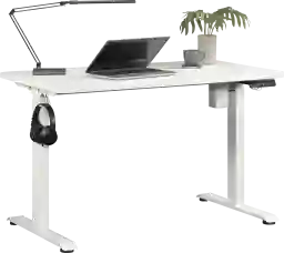 The Cashell white adjustable height desk has an electric height adjustment from 28.35 inches to 47.2 inches. Memory button allows for four pre-set height positions. Hidden wireless charging device for smartphones includes two USB ports for cable charging of mobile devices, one type A and one type C. Two hooks for hanging headphones, purse or bags. Melamine top surface is heat, stain, and scratch resistant. Finished on all sides for versatile placement and has adjustable levelers. Customer assembly is required.