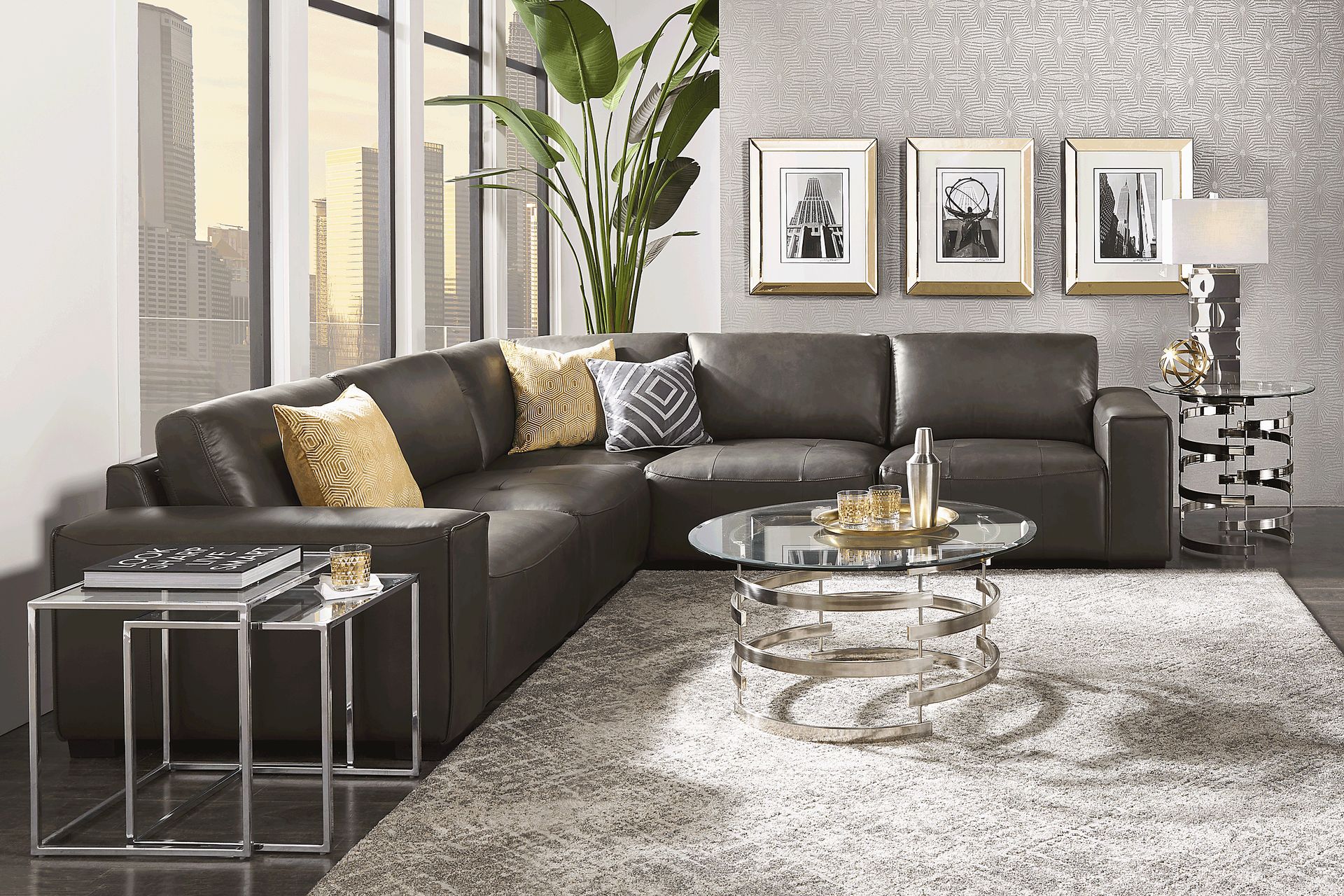 Illustrating modern style, the Cassano sectional provides a spacious centerpiece for your gathering area. Upholstered in luxurious top grain leather where the body touches, each piece is rendered in a sleek dark gray color. Tufted seating and track arms give it an extra touch of elegance. Offering comfort for you and your guests, this sectional has room for up to five adults. Upholstery: Top grain leather where the body touches and polyurethane fabric sides and backs.