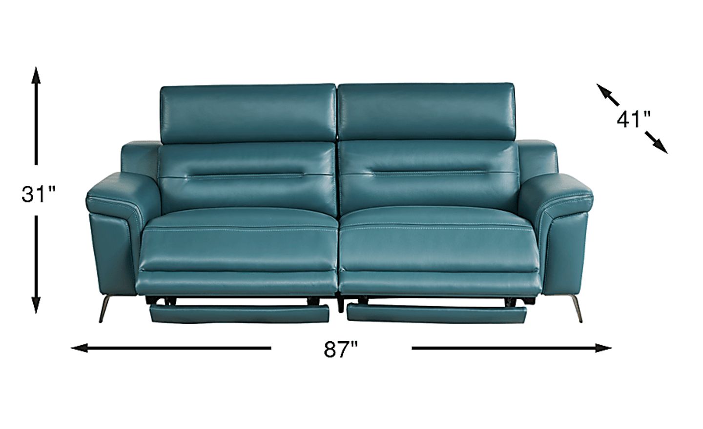 Park Avenue luxury and refinement comes home with the in-the-now Castella dual power reclining sofa. Upholstered in rich, opulent top grain teal leather where the body touches, its high resiliency seat webbing and attached seat cushion deliver immeasurable comfort year after year. Dual power, zero gravity reclining provide the leisurely indulgence of a Manhattan loft, operated by a DC power system for added in-home safety. The stylish flair arms are accompanied by padded outside arms and back and tall, tapered legs for the final flourish of contemporary opulent living. Upholstery: Top grain leather where the body touches and polyurethane fabric sides and backs.