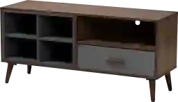 With sleek contemporary design influence, the Castine tv stand adds storage and style to any space. Constructed from sturdy wood showcasing a two-tone finish of grey and walnut brown. This console is equipped with five open shelves, as well as one large drawer, to easily organize all your media devices. This tv stand is also fitted with a cord management hole for easy setup. Angled legs provide excellent stability, making this tv stand a fantastic addition to the modern home. Customer assembly is required.