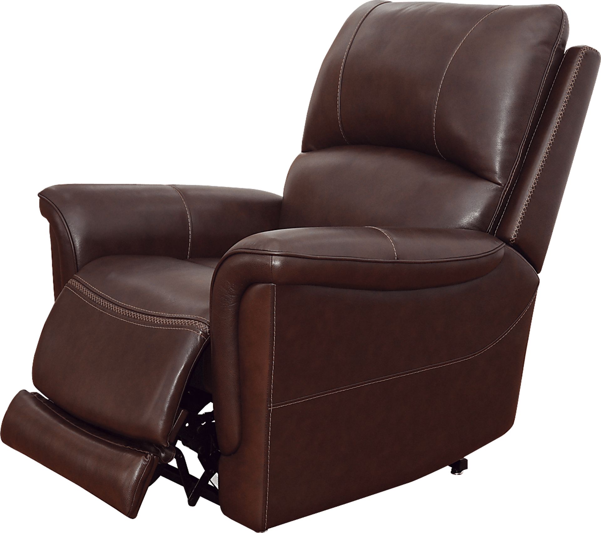 Enjoy the sumptuous feel and premium comfort-enhancing features of the Castmore triple power recliner. Boasting supple brown padded leather where the body touches, this luxurious recliner showcases triple power reclining mechanisms to independently raise and lower the headrest, lumbar support and chaise footrest with the touch of a button. When ready to rise, the attached remote wand has a reset button that returns you to an upright position before once again lifting you to standing. Contemporary design makes it an ideal choice for those with modern style. Plus, a USB-C port built into the remote allows you to conveniently charge devices without ever leaving your seat. Upholstery: top grain leather where the body touches with vinyl sides and back.