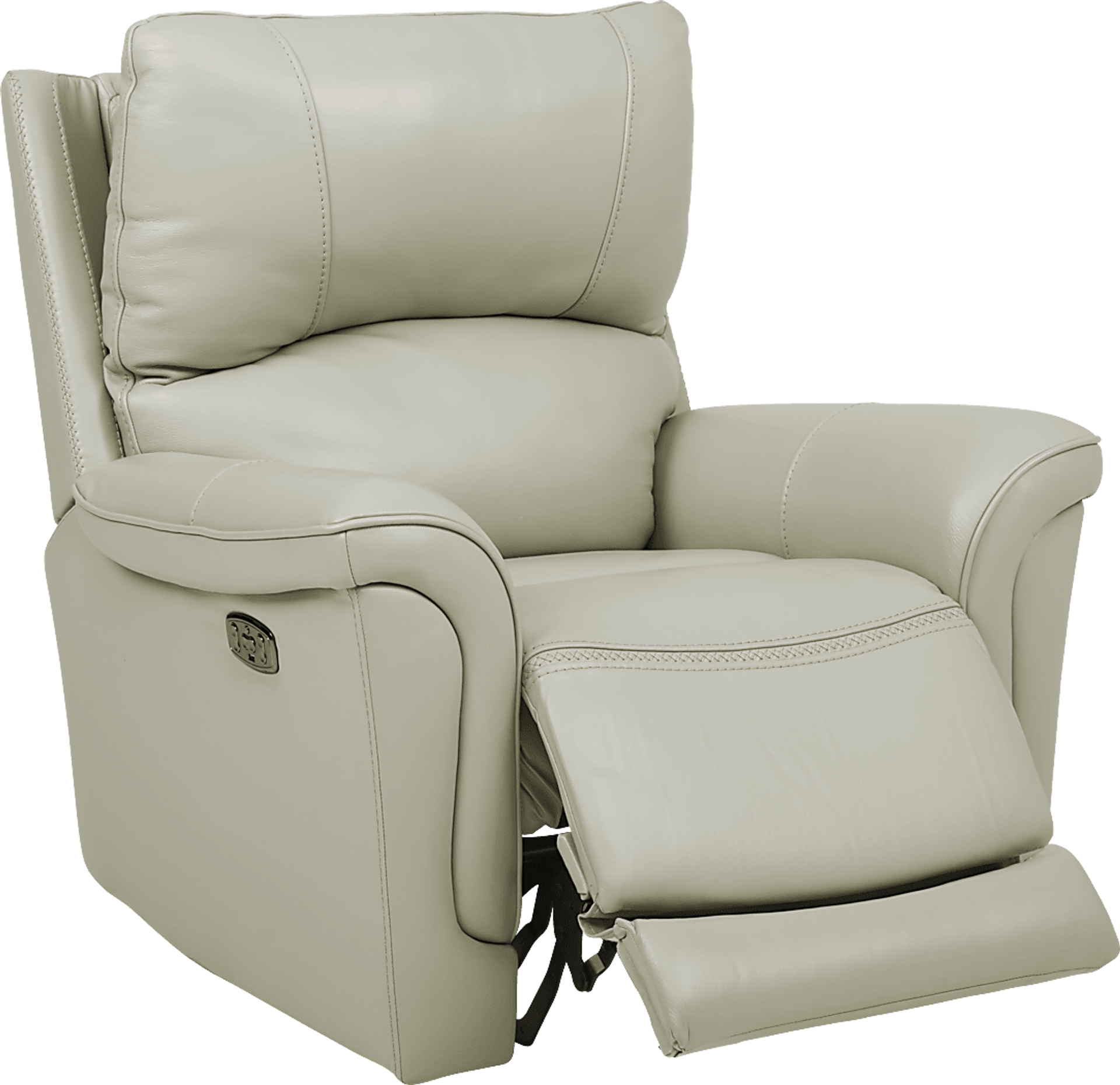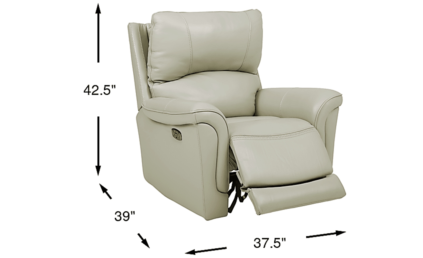 Enjoy the sumptuous feel and premium comfort-enhancing features of the Castmore triple power recliner. Boasting supple stone colored leather where the body touches, this luxurious recliner showcases triple power reclining mechanisms to independently raise and lower the headrest, lumbar support and chaise footrest with the touch of a button. Contemporary design makes it an ideal choice for those with modern style. Plus, a USB port built into the recliner allows you to conveniently charge devices without ever leaving your seat. Top grain leather where the body touches and vinyl sides and backs.