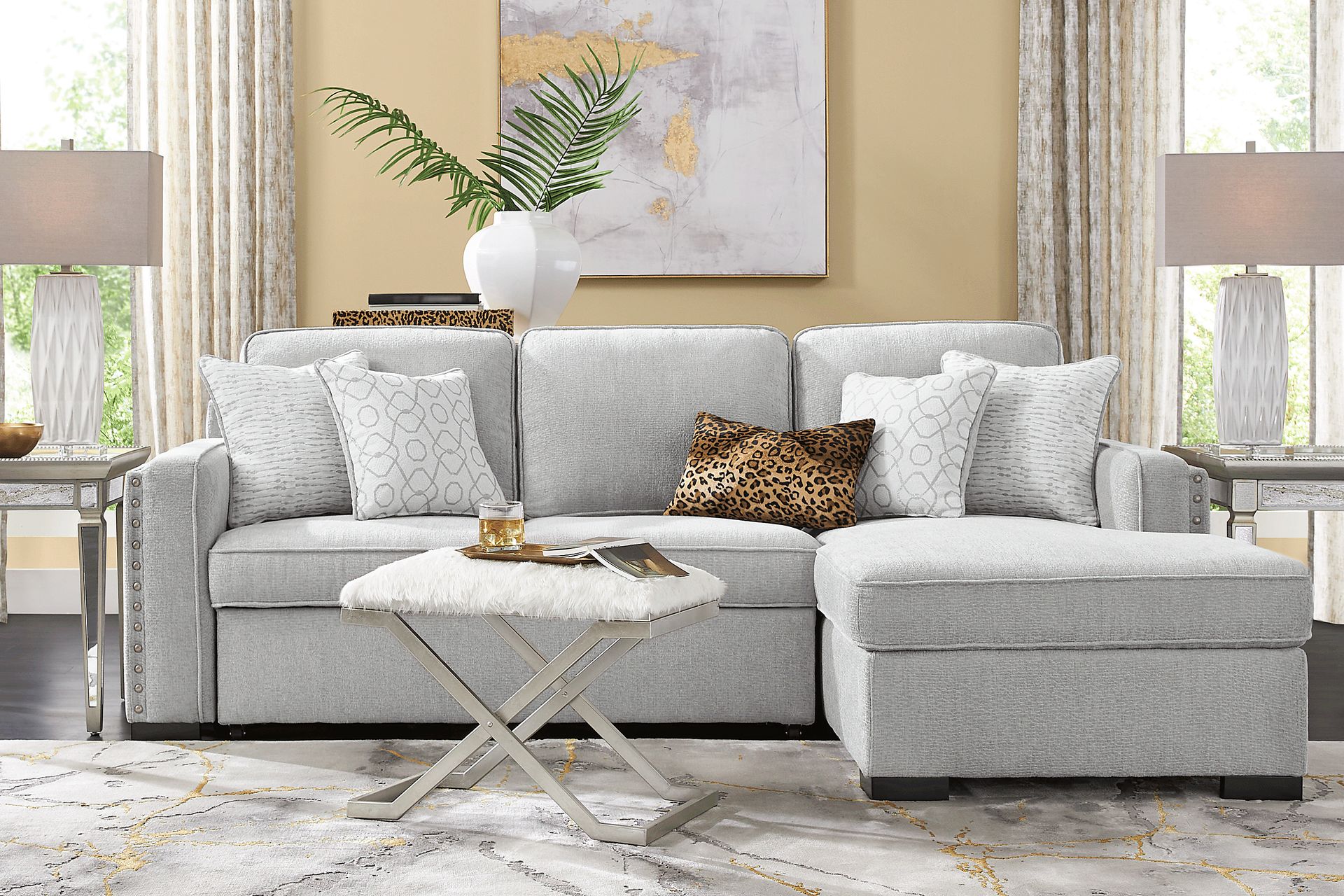 Modern style and multifunctional design bring an intelligent appeal to the Catania sectional. This piece, upholstered in a light and airy gray with handsome nailhead trim details, offers much more than spacious seating. When guests come to stay, a pop-out sleeper creates plenty of comfortable space to spend the night while the storage chaise provides the perfect solution for stowing blankets and pillows. Upholstery: 100% Polyester.